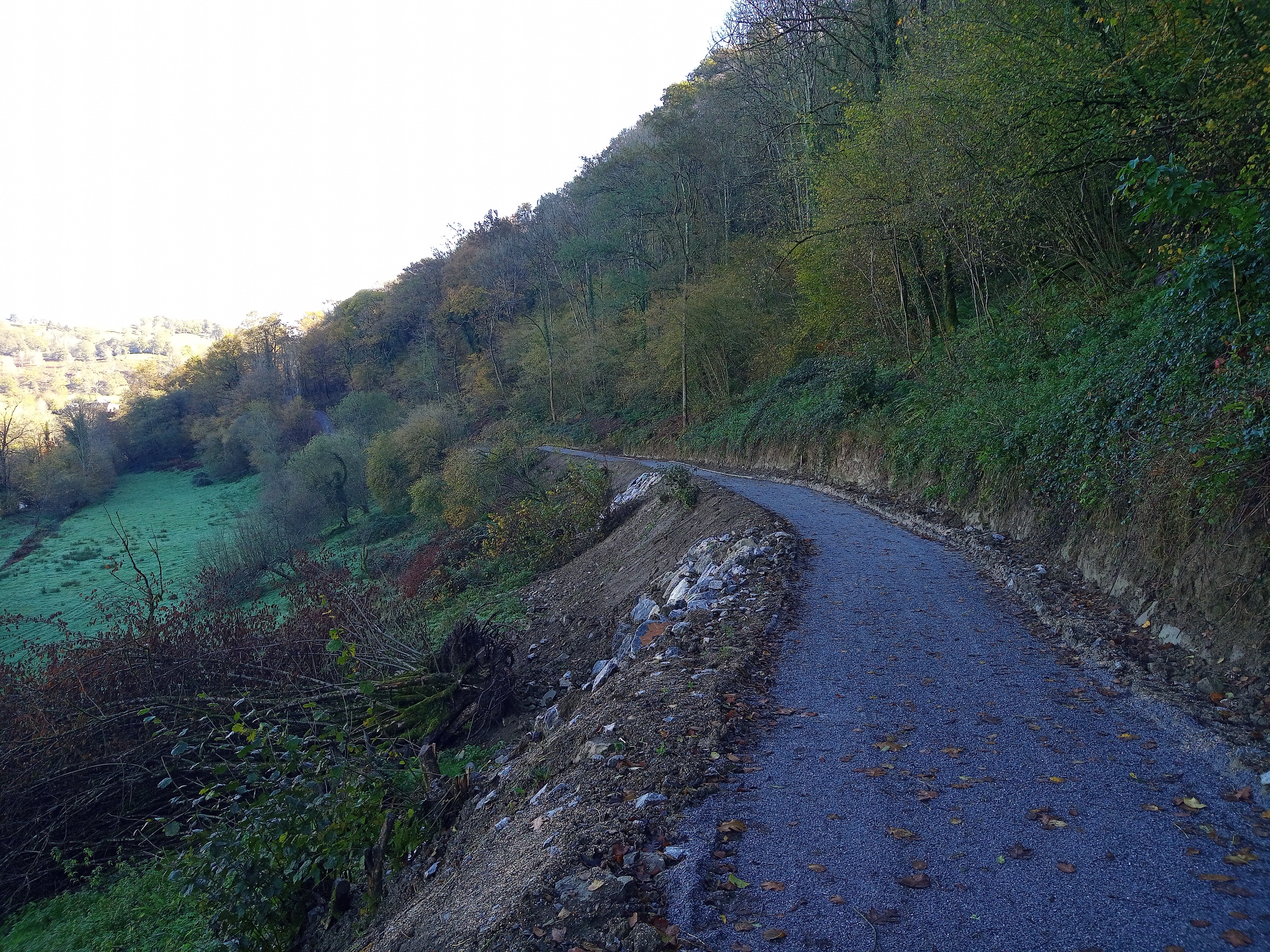 Par les ruelles étroites du quartier du « Bout du pont », et le joli lavoir, et le Chemin de Lengous, on arrive à la Voie Verte créée en plein bois pour assurer une continuité sécurisée dans les gorges du Gave (Km 3,8). C’est un passage difficile (montées) mais très agréable, à l’ombre, en surplomb du Gave que l’on entend.
