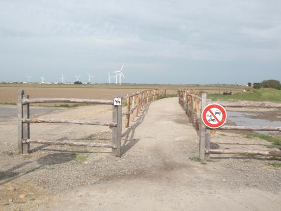 Ensuite, on suit sur 5,5 km une piste-voie verte en site propre, en sable stabilisé, qui traverse le polder du Dain. Elle est d'abord parallèle à la route, et longe les 8 éoliennes installées depuis 2003, et souvent en action.