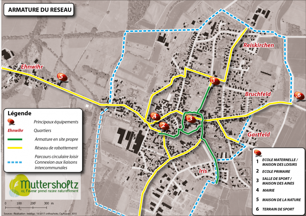 A coup de rachat de terrains privés et d’entente avec certains propriétaires, le maire de Mutterholtz a fini par créer une piste cyclable qui permet de réaliser ce vœu. un réseau de liaisons douces a été aménagé pour rejoindre, à pied et à vélo, les principaux établissement publics et les commerces du village. Ainsi, Il est désormais possible de relier l’école maternelle à l’école élémentaire en site complètement sécurisé (en vert sur le plan).