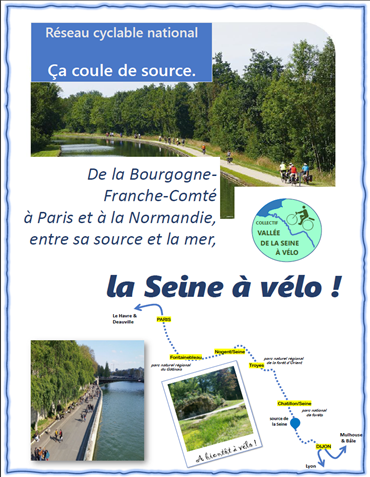 Le collectif, qui regroupe 8 associations dont l’AF3V, milite pour la réalisation de la véloroute V33 à l’amont de la Seine, entre Paris et Dijon (444 km), en passant par la source de la Seine.