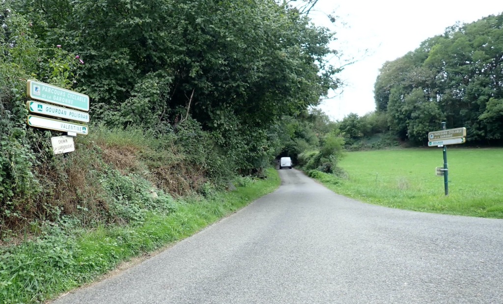 A cet endroit une liaison est jalonnée avec la gare de Montréjeau. On peut éviter cette boucle de 7km en traversant Labroquère sur la rue principale (voir parcours repéré AF3V 1,6km).