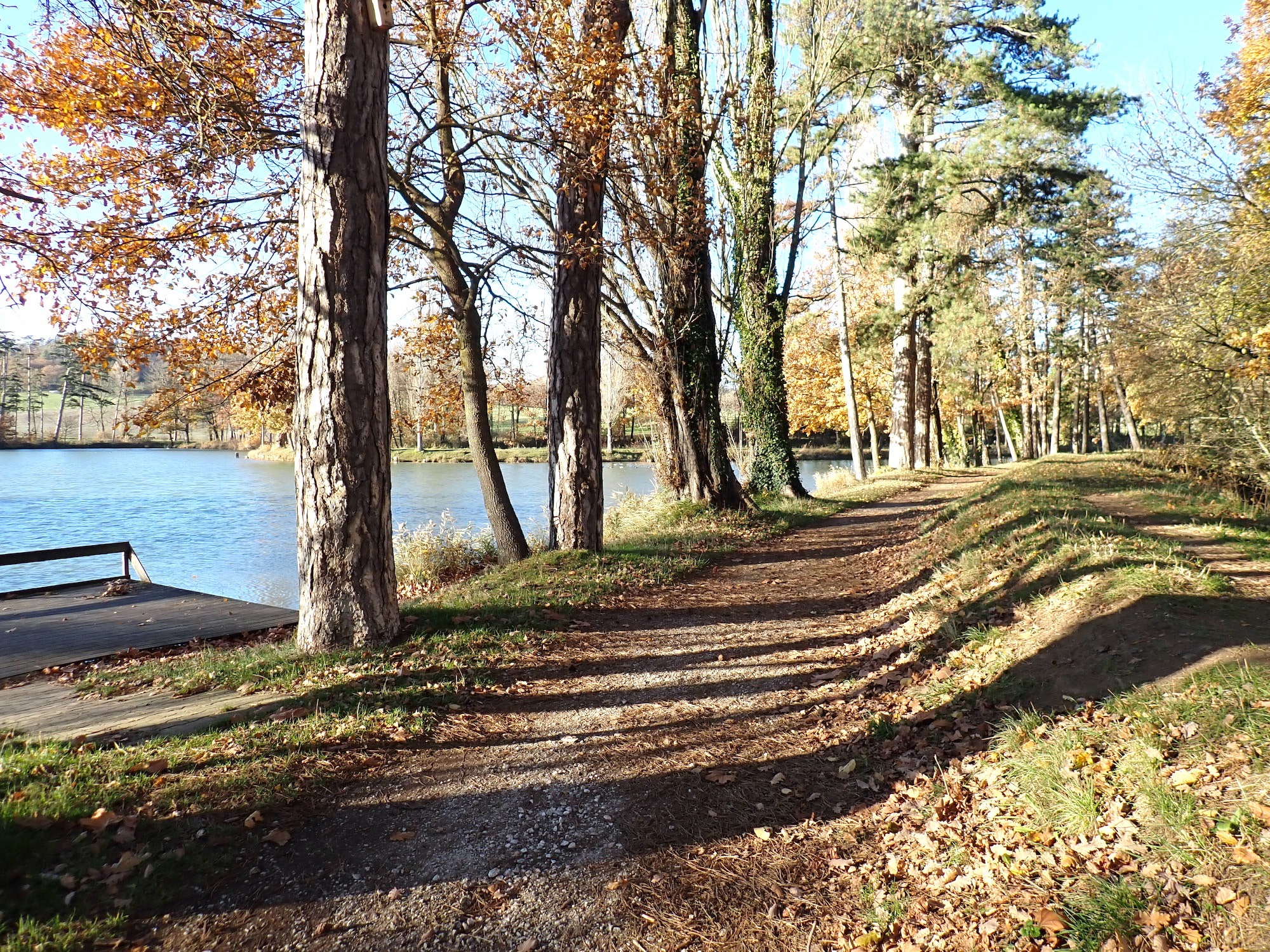 Au Km 23 environ on arrive au Lac de Lenclas dont on fait le tour sur un chemin en sable stabilisé de bonne qualité, avec tables et bancs et une fontaine au parking. On passe devant le parking et le bar-restaurant du Lac (qui a brûlé en décembre 2025).