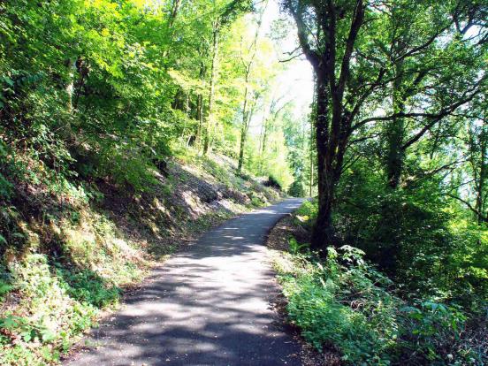 Au-delà le parcours monte avec des pentes de 12% et plus, difficiles et réservées aux VTT non chargés (la Voie Verte a été goudronnée dans la montée seulement).