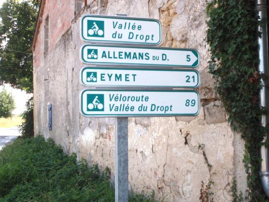 La signalétique est claire et bien réalisée car on retrouve sur les panneaux le nom : « Véloroute vallée du Dropt » ou « Vallée du Dropt », et tous les 15 à 20km des panneaux donnant les distances.