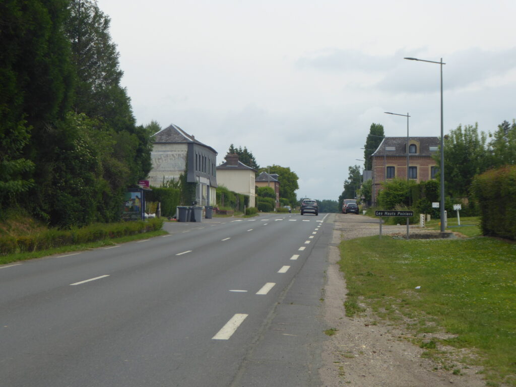 Hélas, les 10 premiers kilomètres entre Rouen et Quincampoix (ou les 10 derniers dans l’autre sens) emmènent à plusieurs reprises les cyclistes sur une départementale à fort trafic, où passent dans sa partie la moins circulée 8 000 véhicules/jour, plus du double dans sa partie la plus circulée, sans aménagements dignes de ce nom, voire sans aménagements tout court ! Et de surcroit, sans intérêt patrimonial.