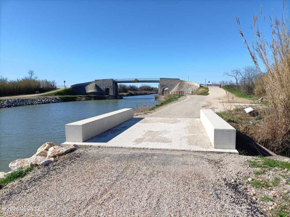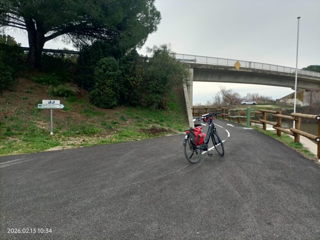 En ce moment, pour accéder à la voie verte EV8 il faut prendre depuis le centre de Saint-Gilles à droite du pont routier vers l’ouest pour rejoindre le bord du canal. Les travaux sont encore en cours en direction de Bellegarde ce qui empêche de passer par dessous le pont.