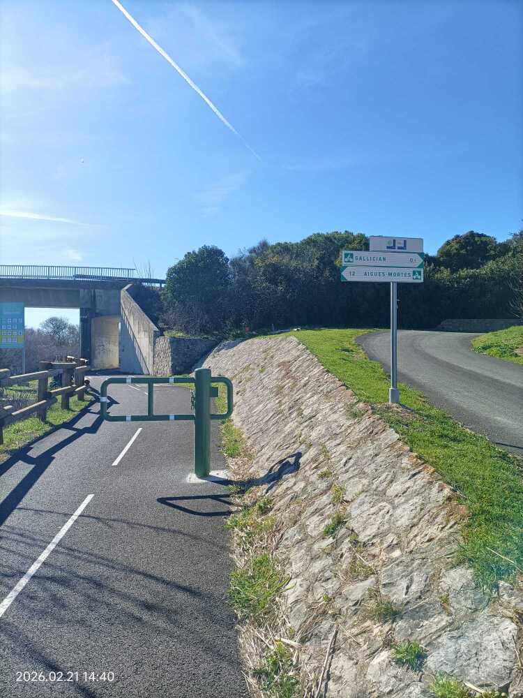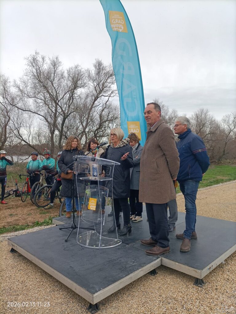Les photos de l’inauguration ne concernent que le tronçon de 9,5 km entre le Pont d’Espeyran et Gallician. On note un décalage entre la description du projet « enrobé bicouche gravillonné ocre » sans référence à un complément d’enrobé liant lisse. Ce sera à surveiller.
