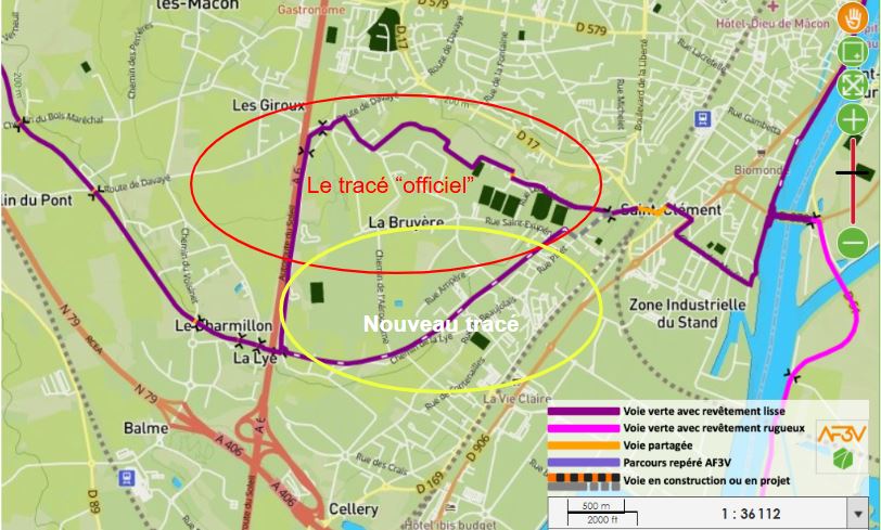 La Voie Verte de Bourgogne du sud en Val Lamartinien, de Cluny à Mâcon ouverte depuis 2004, entre Mâcon et Cluny, se rattachait à proximité de la gare de Mâcon par un détour par Charnay lès Mâcon. Cela avait très peu d’attrait touristique… ou pratique (distance, à travers les parkings du stade,le long de l’autoroute A6,etc..).