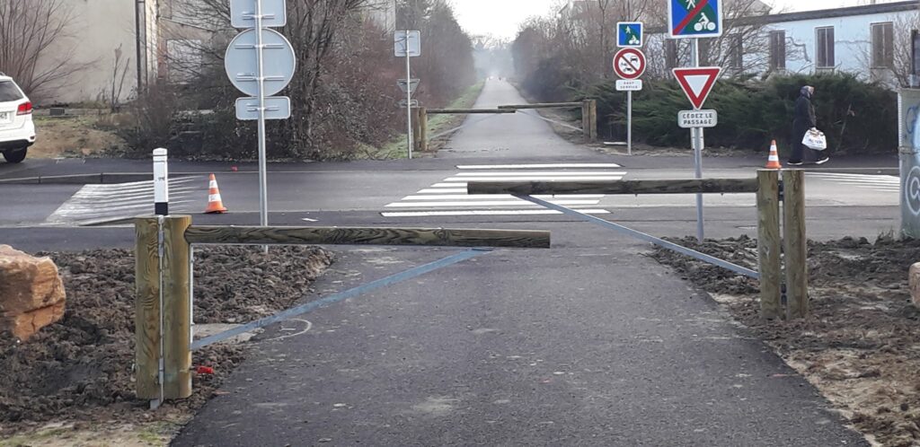 Si la largeur de 1,5 mètres est respectée pour le passage d’un fauteuil roulant, elle est bien insuffisante pour la passage des cycles, de tous genres.