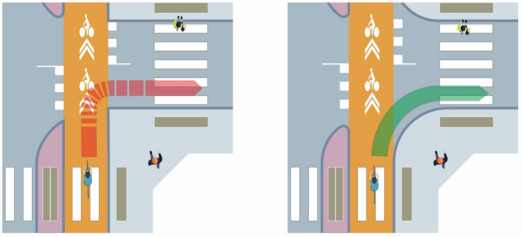 Le projet d’aménagement ne prend pas suffisamment en compte les circulations des cyclistes, suivant les recommandations du Cerema de 2021 et de 2025: rayons de giration, sur largeurs, zone d’attente et de stockage, etc…