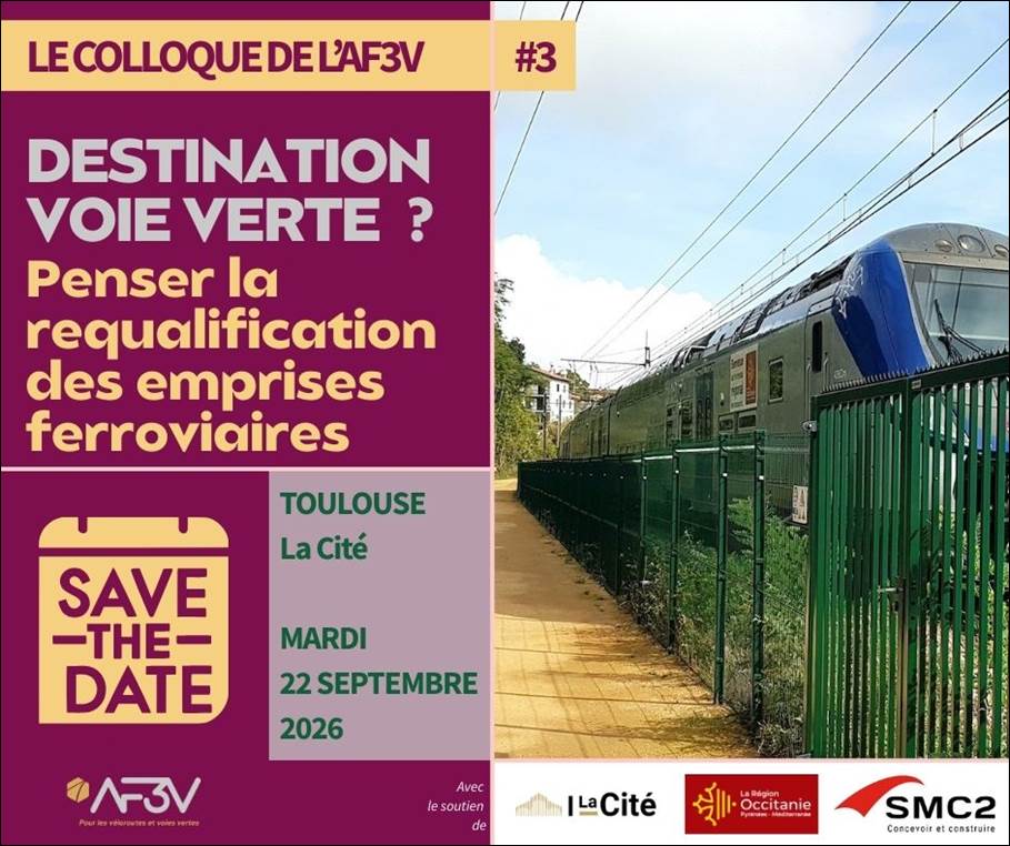 Le mardi 22 septembre 2026, participez au 3e colloque de l’AF3V ! Grâce au soutien de la Région Occitanie nous vous accueillerons dans ce magnifique espace qu’est La Cité. A l’heure où les budgets se resserrent pour le développement des mobilités, quel potentiel offre les anciennes emprises ferroviaires ? Faut-il les réserver aux mobilités actives, les rouvrir…